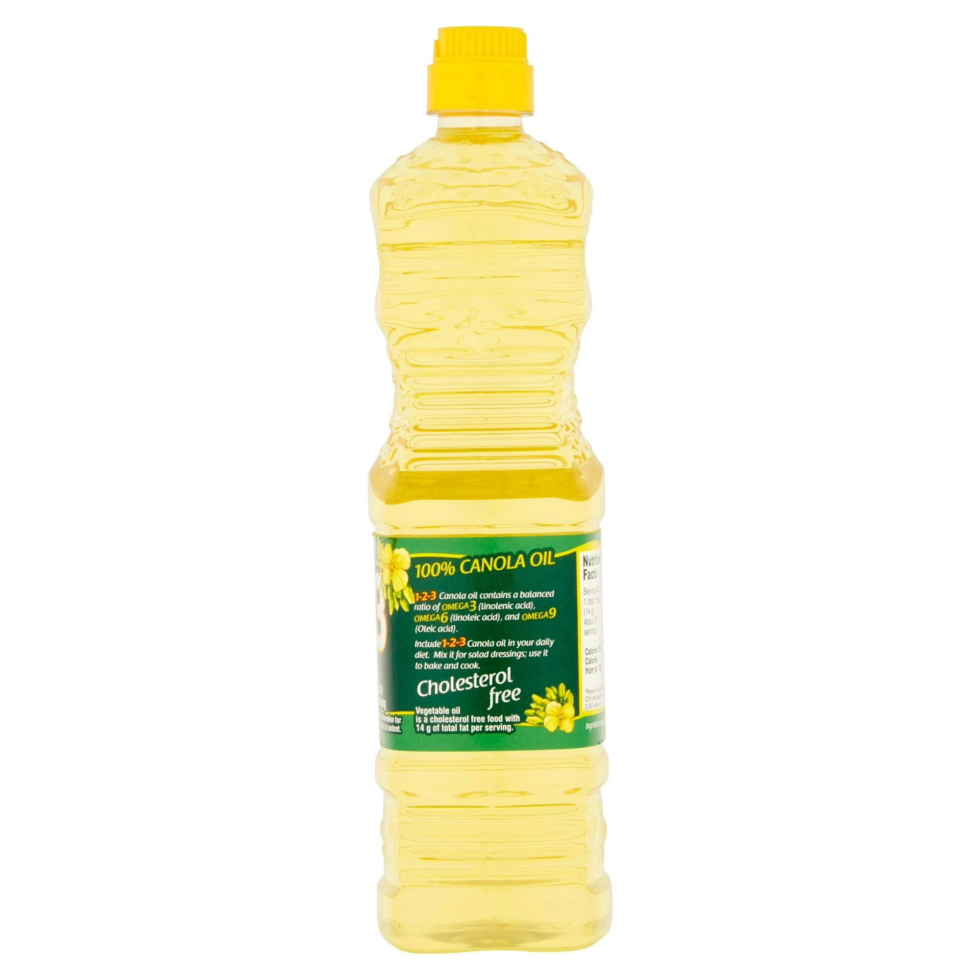 • Pure canola oil with omega 3, 6 & 9. 0 g trans fat per serving. See nutritional information for total fat and sat. fat content. 100% canola oil. 1-2-3 canola oil contains a balanced ratio of omega 3 (linoleic acid), omega 6 (linoleic acid), omega 9 (oleic acid). Include 1-2-3 Canola oil in your daily diet. Mix it for salad dressings; use it to bake and cook. Cholesterol free. Vegetable oil is a cholesterol free food with 14 g total fat per serving. Product of Mexico.