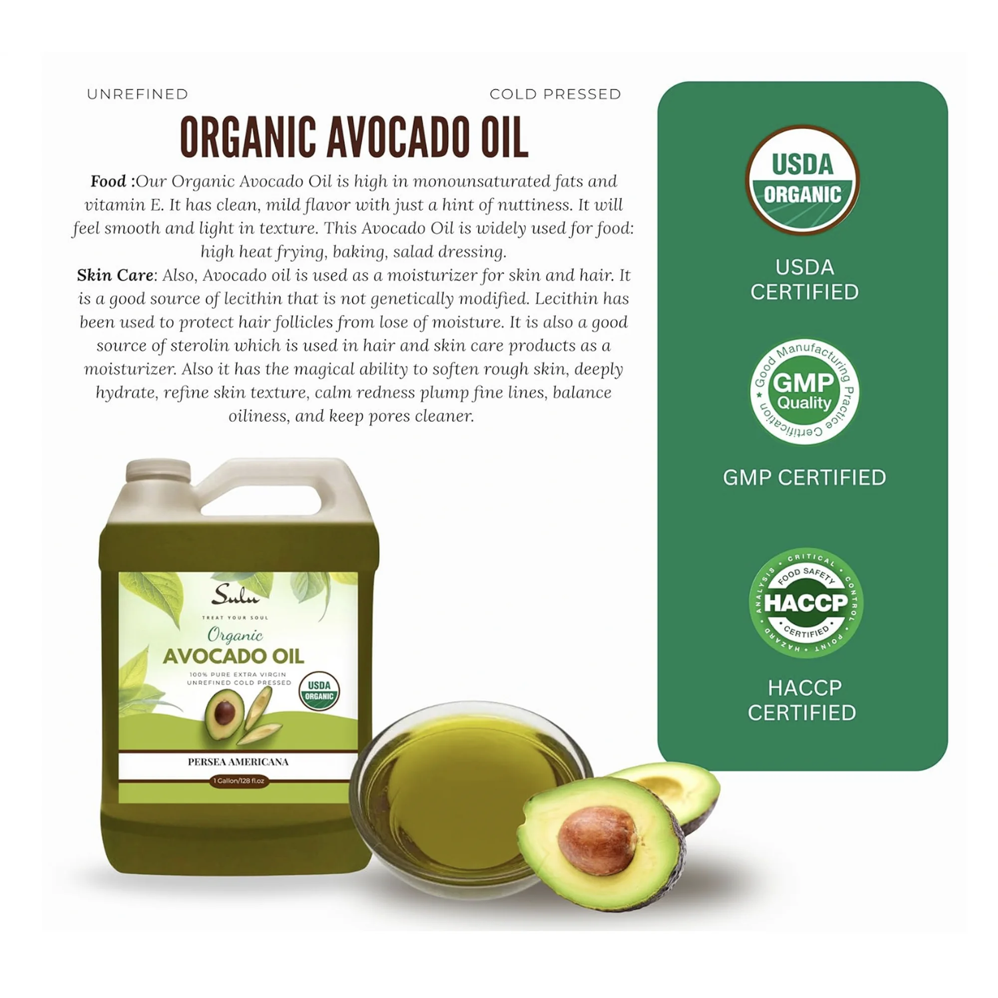 Food :Our Organic Avocado Oil is high in monounsaturated fats and vitamin E. It has clean, mild flavor with just a hint of nuttiness. It will feel smooth and light in texture. This Avocado Oil is widely used for food: high heat frying, baking, salad dressing. Skin Care: Also, Avocado oil is used as a moisturizer for skin and hair. It is a good source of lecithin that is not genetically modified. Lecithin has been used to protect hair follicles from lose of moisture. It is also a good source of sterolin which is used in hair and skin care products as a moisturizer. Also it has the magical ability to soften rough skin, deeply hydrate, refine skin texture, calm redness plump fine lines, balance oiliness, and keep pores cleaner.