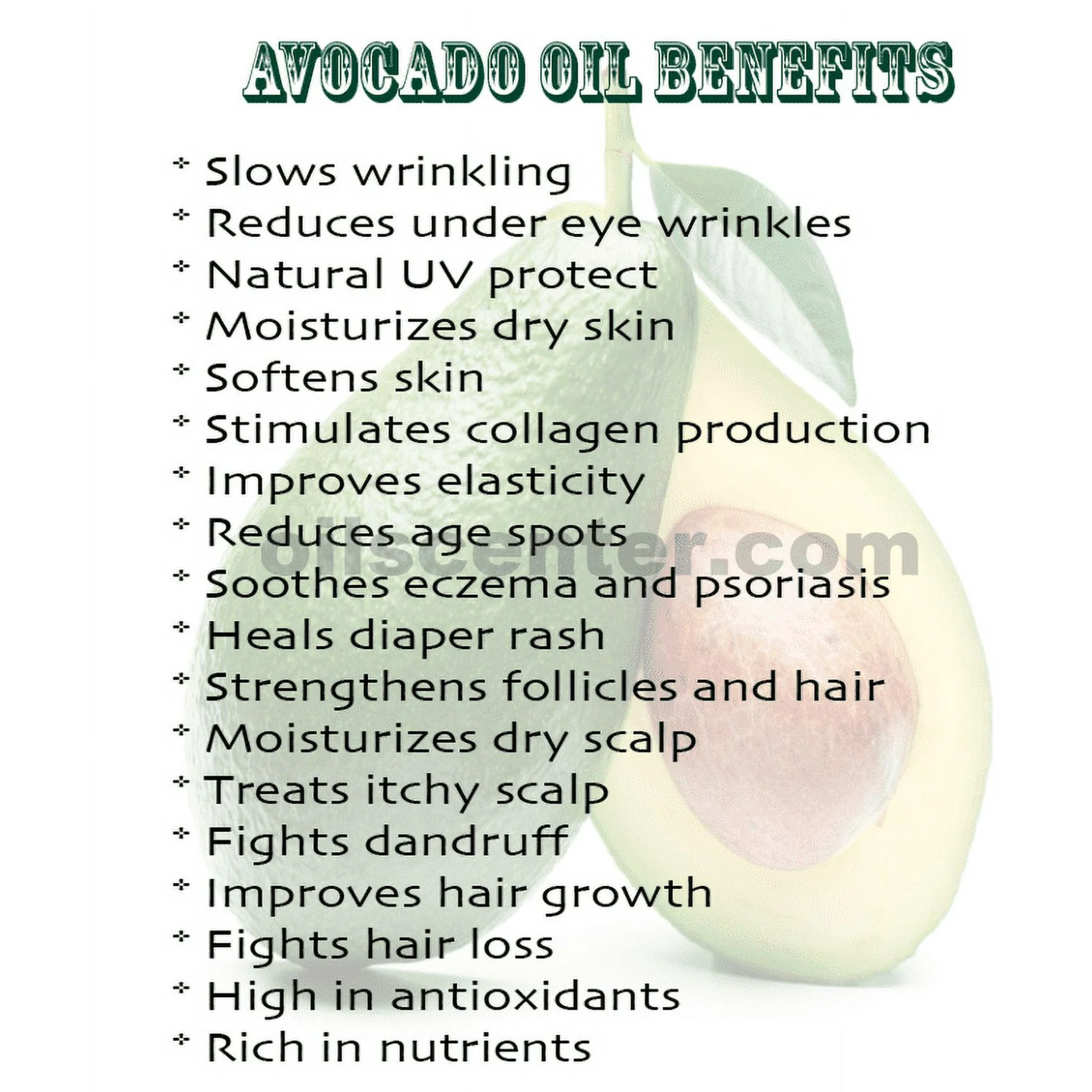 Description: Avocado Carrier Oil contains Vitamins A, B1, B2, D, E, and Beta carotene. It is classified as monounsaturated oil and is best suited for dry skin conditions in topical applications.