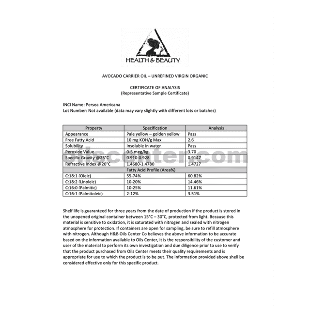 Shelf Life: Avocado Carrier Oil is slow to go rancid; users can expect a shelf life of 1 year with proper storage conditions (cool, out of direct sunlight). Refrigeration after opening is recommended.