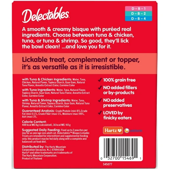 - TEXTURE VARIETY: Hartz Delectables Lickable Cat Treats are available in 6 irresistible textures in a wide variety of flavors – bisque, stew, savory broths, chowder, soft pate, and squeeze ups.