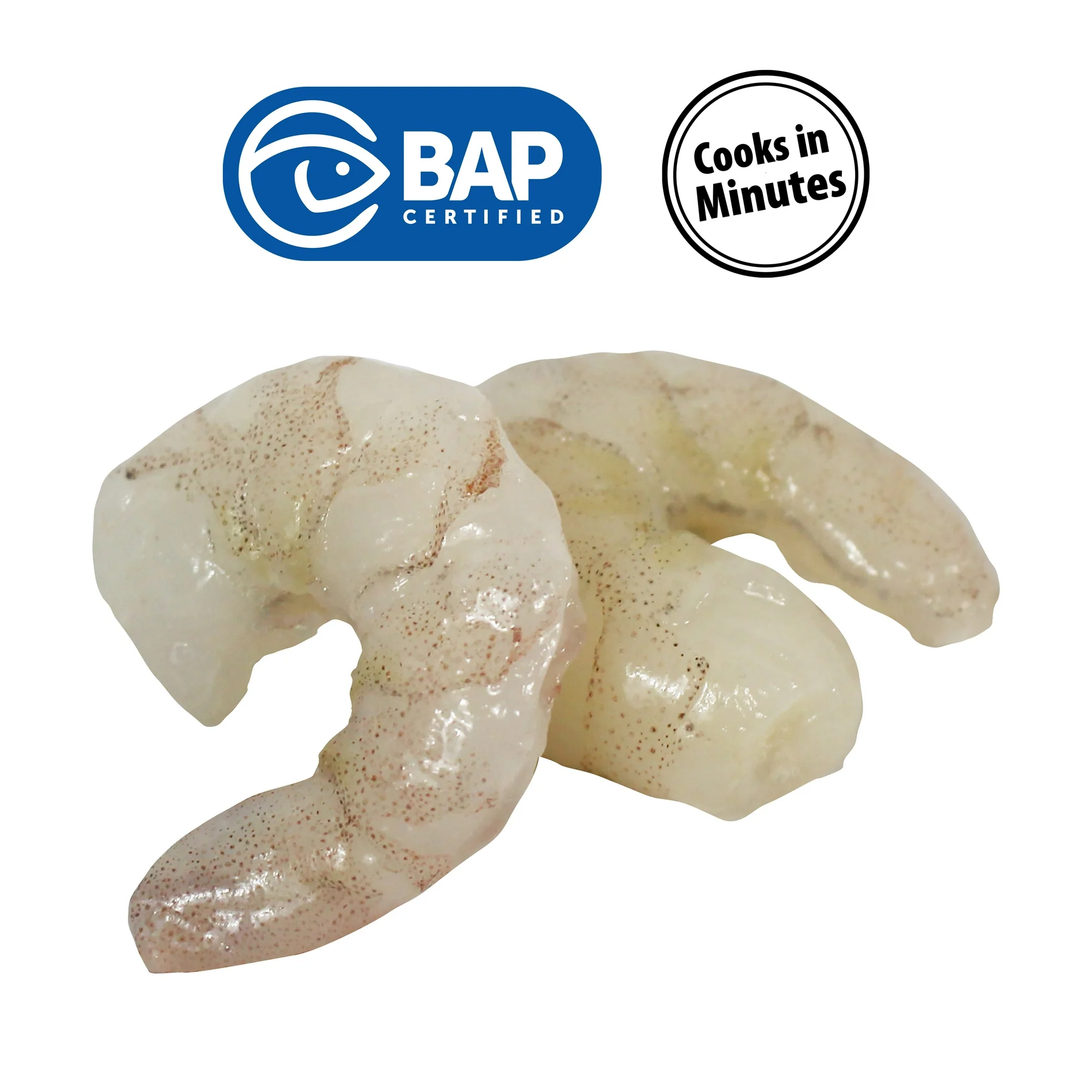 Our Small Shrimp are raw, peeled, deveined, and tail off. The versatility of these shrimp lends itself to a variety of preparations including fried, broiled, baked, or grilled. Ready to cook in minutes use them to make crispy breaded shrimp, mix into a shrimp scampi or a shrimp cocktail. They are a great low calorie, lean source of protein. This product is sustainably sourced and third-party certified as meeting the Best Aquaculture Practices standards for the entire production chain – farm, processing plant, hatchery, and feed mill. This third-party certification focuses on food safety, social welfare, environmental impact, and animal health and welfare, making our shrimp a responsible seafood choice. Enjoying your favorite seafood is easy with our Raw Small Shrimp.