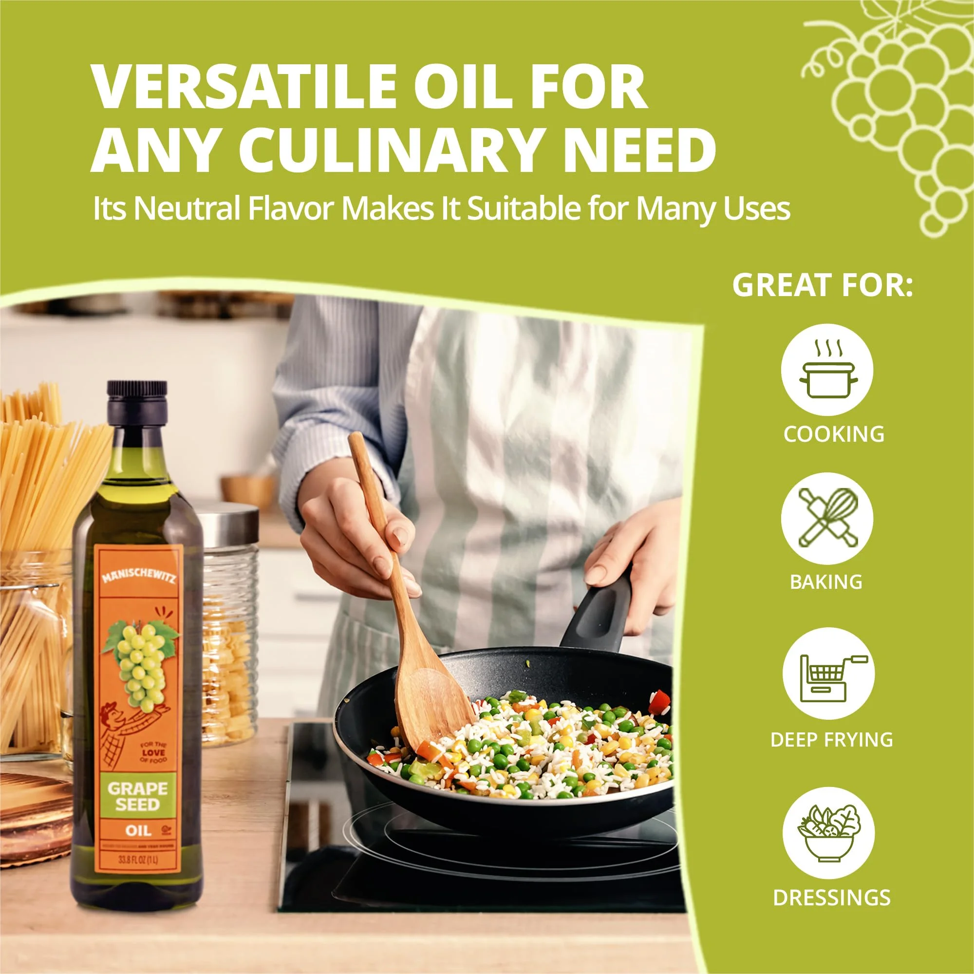 • LIGHT & NEUTRAL FLAVOR – Experience the versatility of our grapeseed cooking oil with its light and neutral flavor. Ideal for sautéing, frying, and baking, it allows the natural flavors of your ingredients to shine through without overwhelming your dishes. A must have for health conscious chefs seeking a heart-healthy alternative.