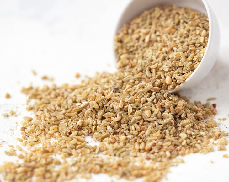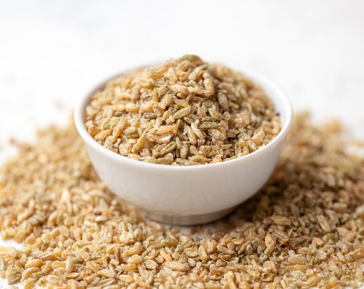 Freekeh is a wheat grain that comes from young durum wheat that’s roasted or smoked and then polished to get the husk off. It’s mentioned in the Bible, being discovered by accident, when soldiers in the eastern Mediterranean tried to destroy the crop. When they tried to salvage what they could, the locals realized that if you remove the burned shells, you end up with delicious green grains. The grains are mild green/brown and very similar to bulgur wheat. They have a rich, nutty flavor. It’s a fantastic addition to soups, stews, salads, and pilafs, freekeh cooks like rice or barley, and works terrific as a stuffing. Whole grain freekeh is an excellent choice for those that follow a low-Glycemic Index diet. It has higher dietary fiber and protein levels than standard wheat and is a source of calcium, potassium, iron, and zinc. Like all forms of wheat, freekeh is an excellent source of nutrients, specifically protein, fiber, B Vitamins, and a whole host of vital minerals.