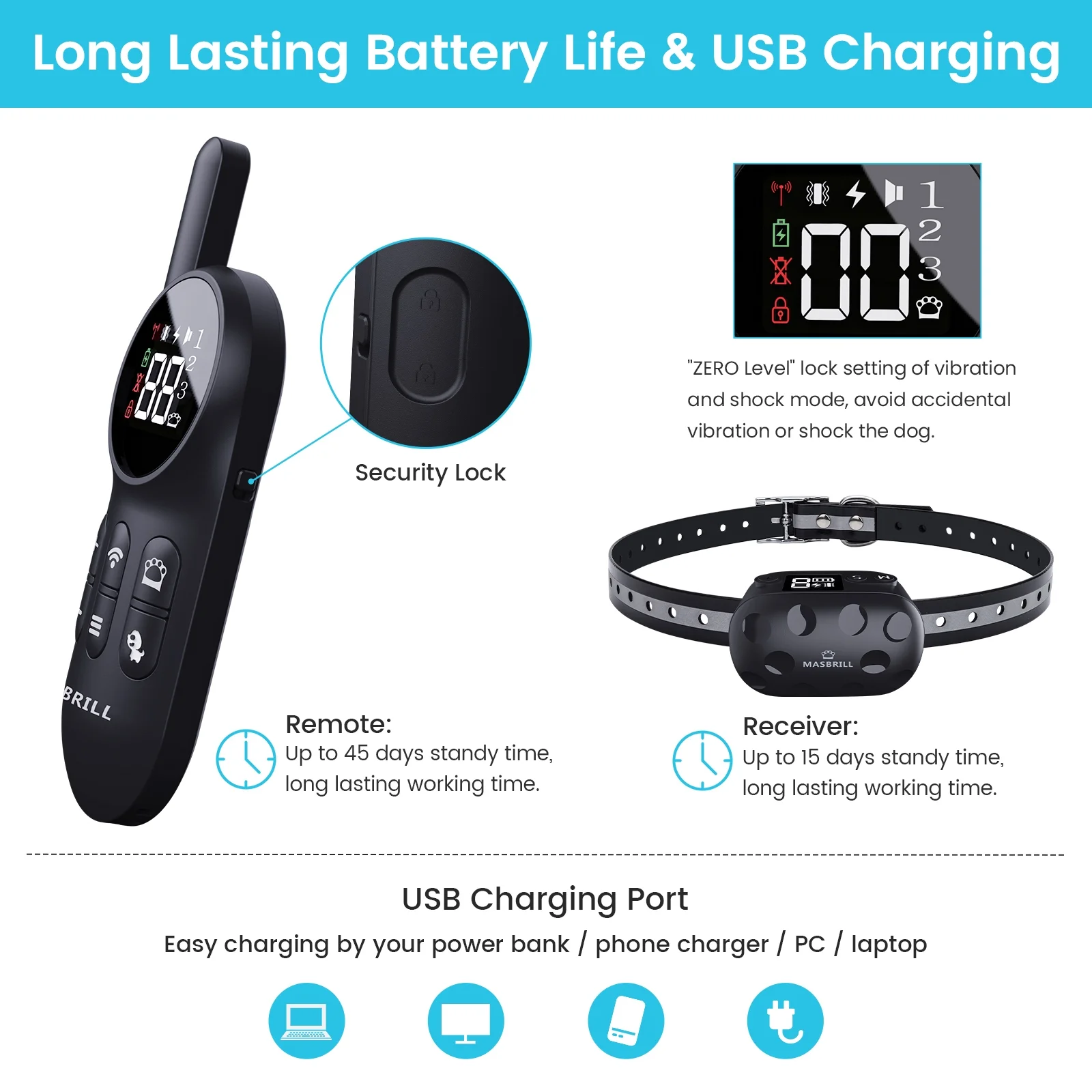 • Dual-Charging & Extended Battery Life Both transmitter and collar feature rechargeable lithium batteries (USB charging) with 60-day standby time – outperforming most dog training collars with remote. The smart power-saving mode automatically activates after 5 minutes of inactivity.