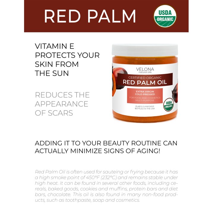 - 100% PUER & NATURAL USDA Certified Organic EXTRA VIRGIN RED PALM OIL is extracted from the pulp of the tree of NATURAL – cultivated palm tree Elaeis Guineensis, by mechanical pressing, without the use of solvents. This product is imported from Brazil; NATURAL Extra Virgin Palm Oil is considered Vegan, Lactose Free, Gluten Free, Glutamate Free, and BSE Free